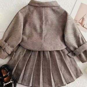 Two Piece Set of Casual Tweed Lapel Coat and Retro Pleated Skirt