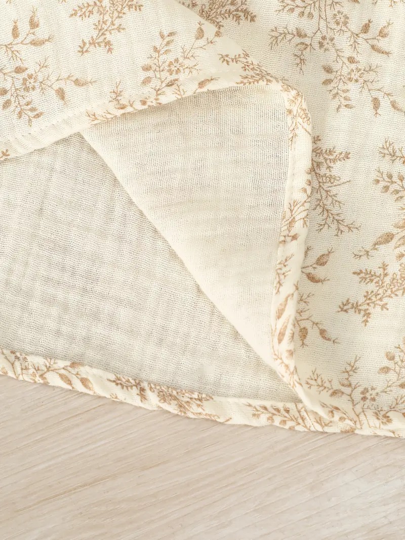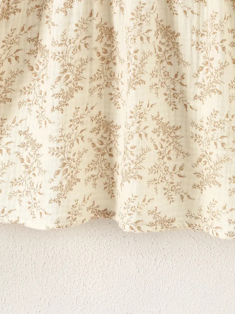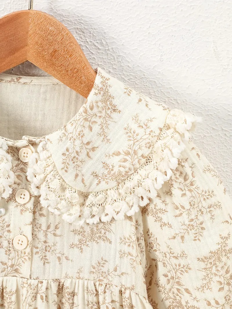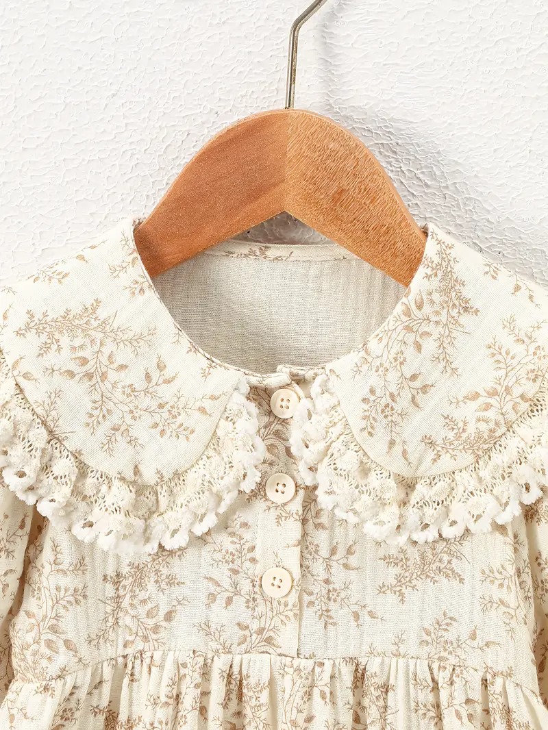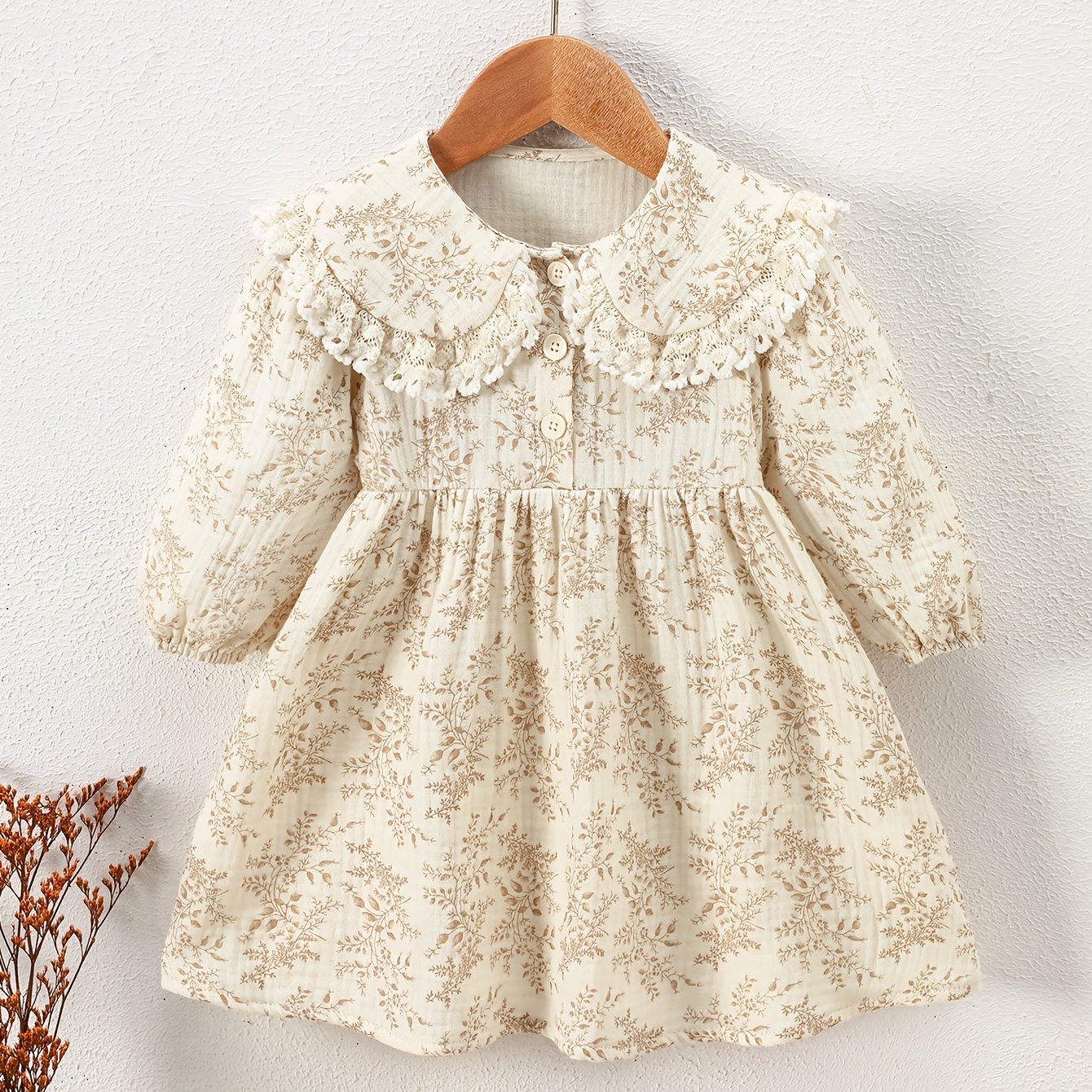 - 1pc Girls’ Floral Print Dress with Ruffled Collar & Long Sleeves
