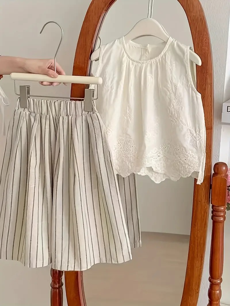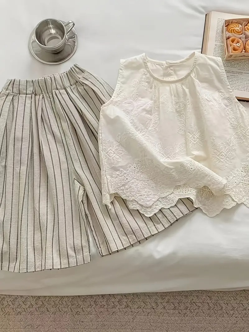 - 2 pieces set: Girls’ Embroidered Vest Set, Forest Style Kids Top with Hollow Sleeveless Design and Fashionable Cotton Striped Wide-Leg Pants, Perfect for Outdoor
