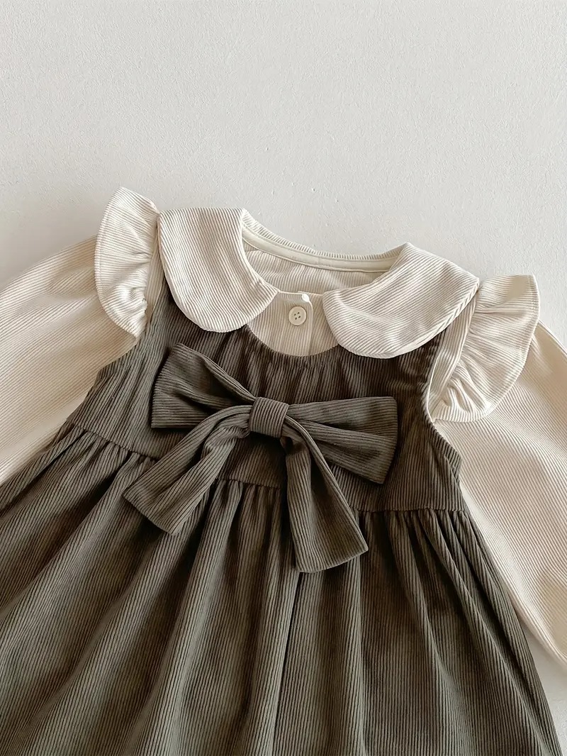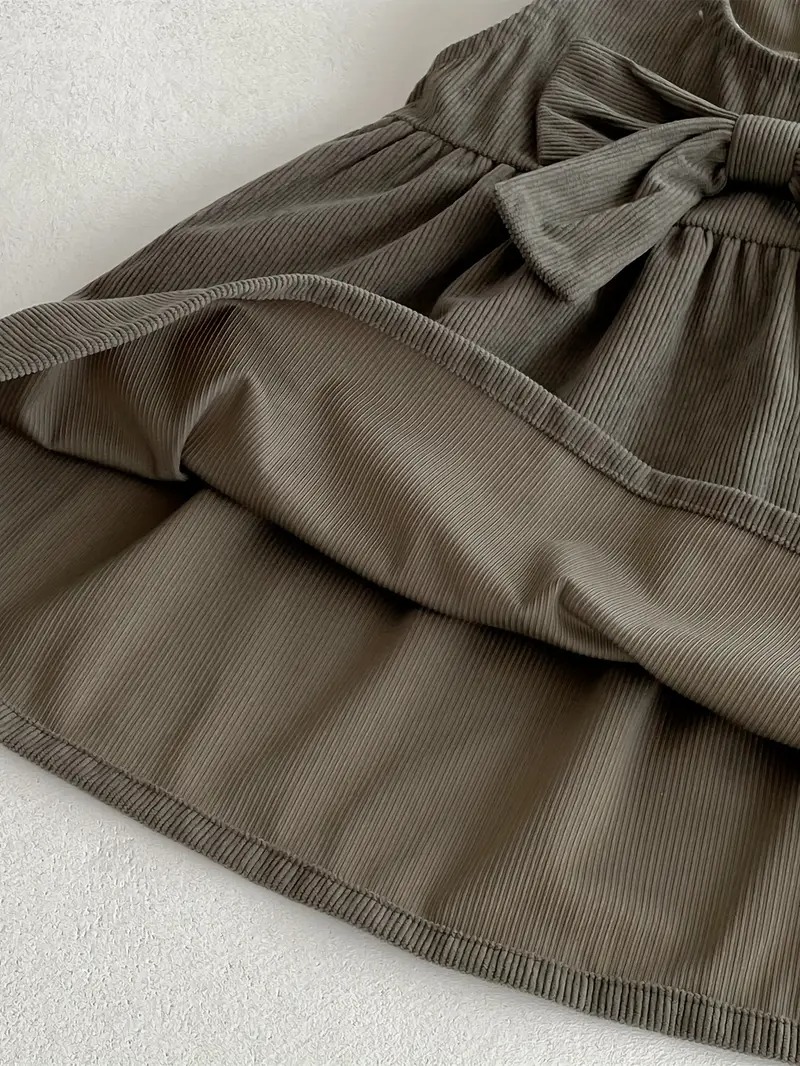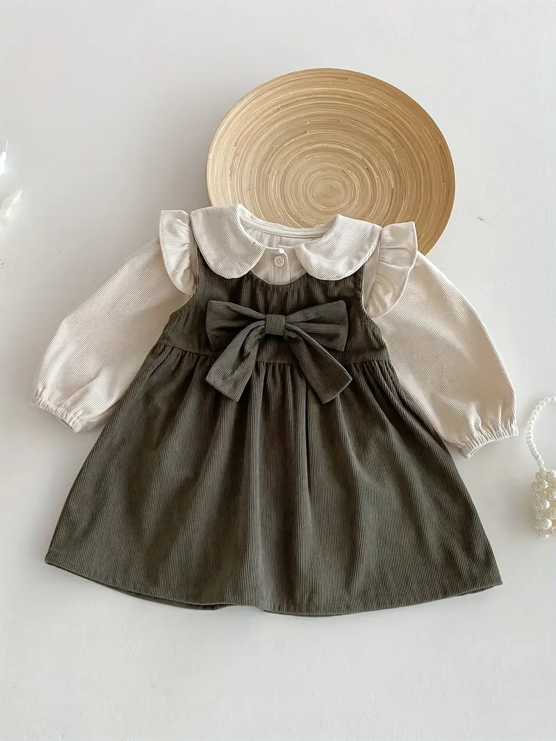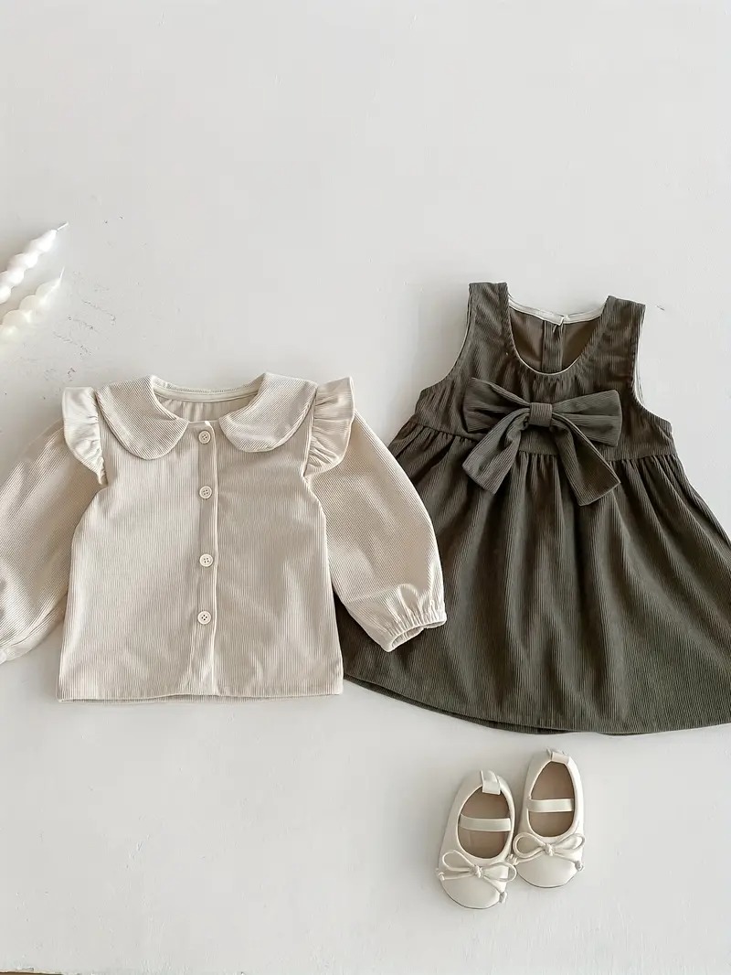 - 2 pieces Set of Beige Waffle Collar Long Sleeve Cardigan and Dark Green Bow Dress for Casual Comfortable Daily Wear.