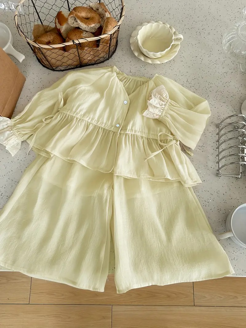 - 2pcs Set Girls’ Summer New Style Ruffle Shirt and Wide Leg Pants