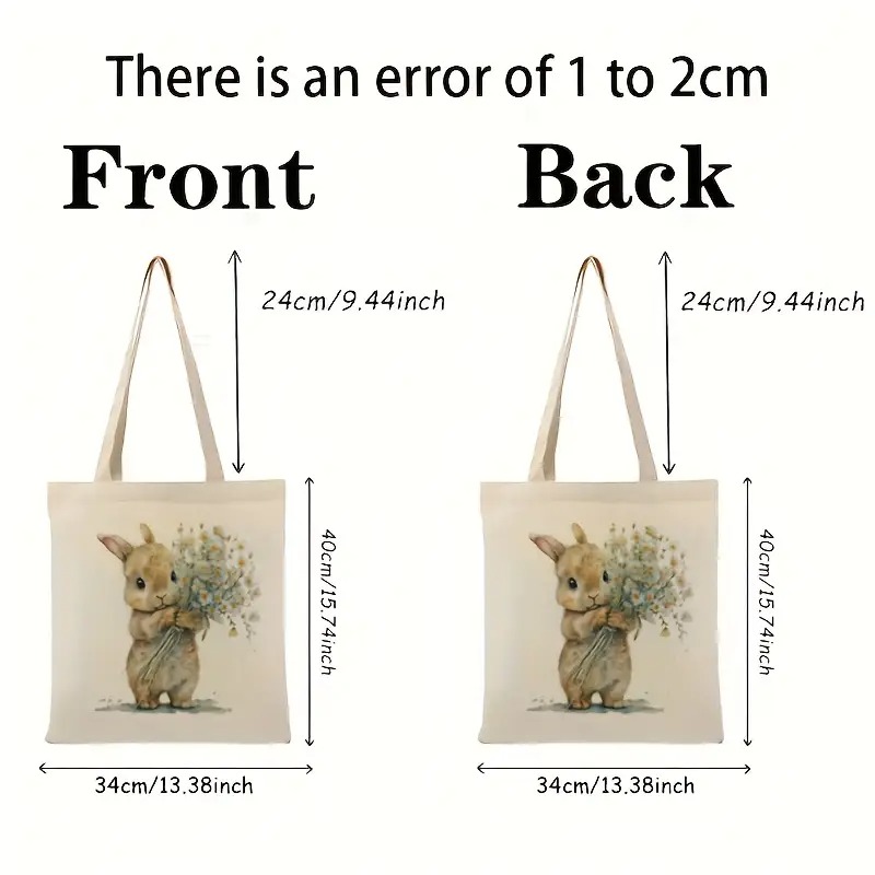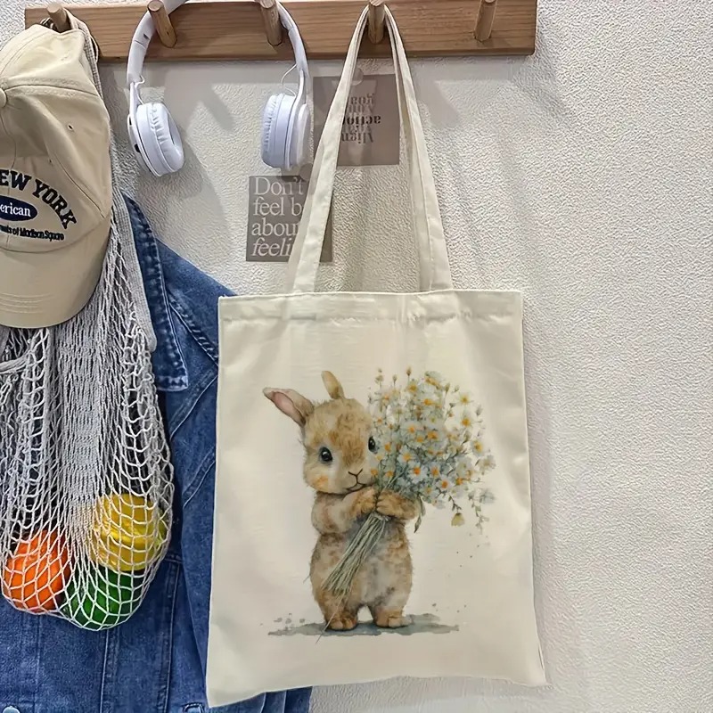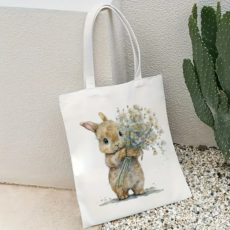 1pc Adorable Bunny Canvas Tote Bag with Vibrant Floral Print