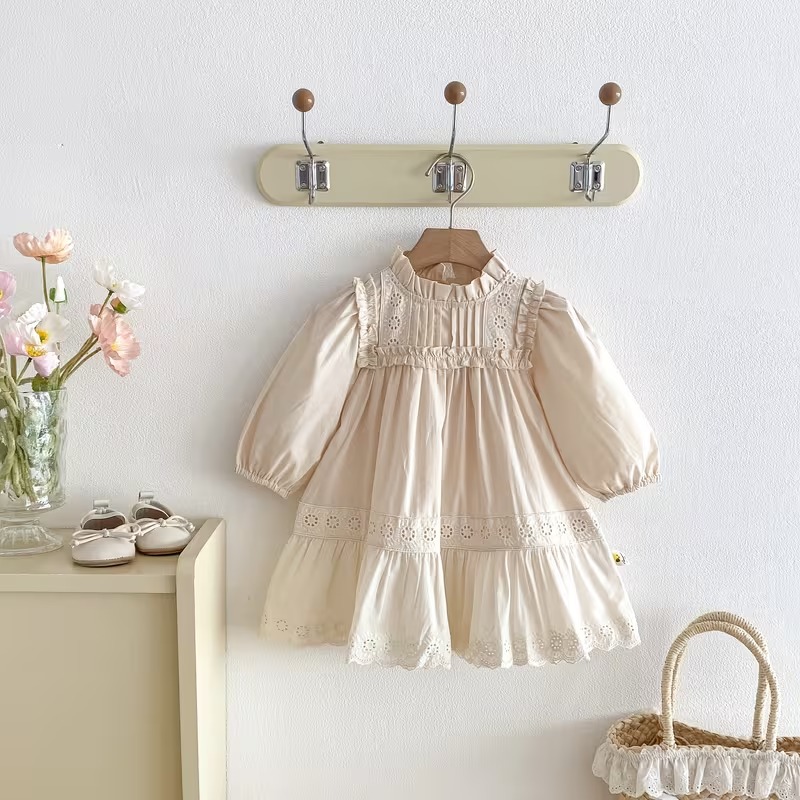 Girls’ Elegant Floral Print Dress with Stand Collar & Long Sleeves