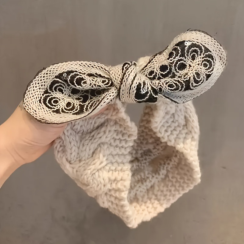 Chic Beige & Black Floral Embroidered Knit Bow Headband