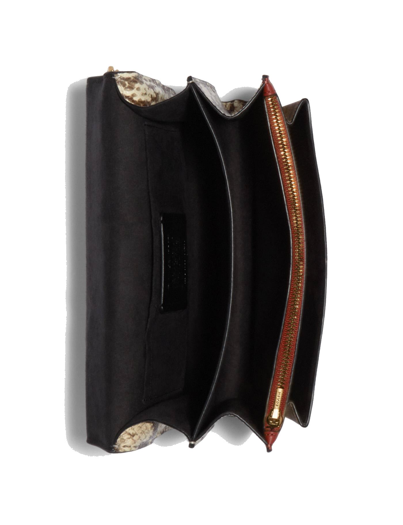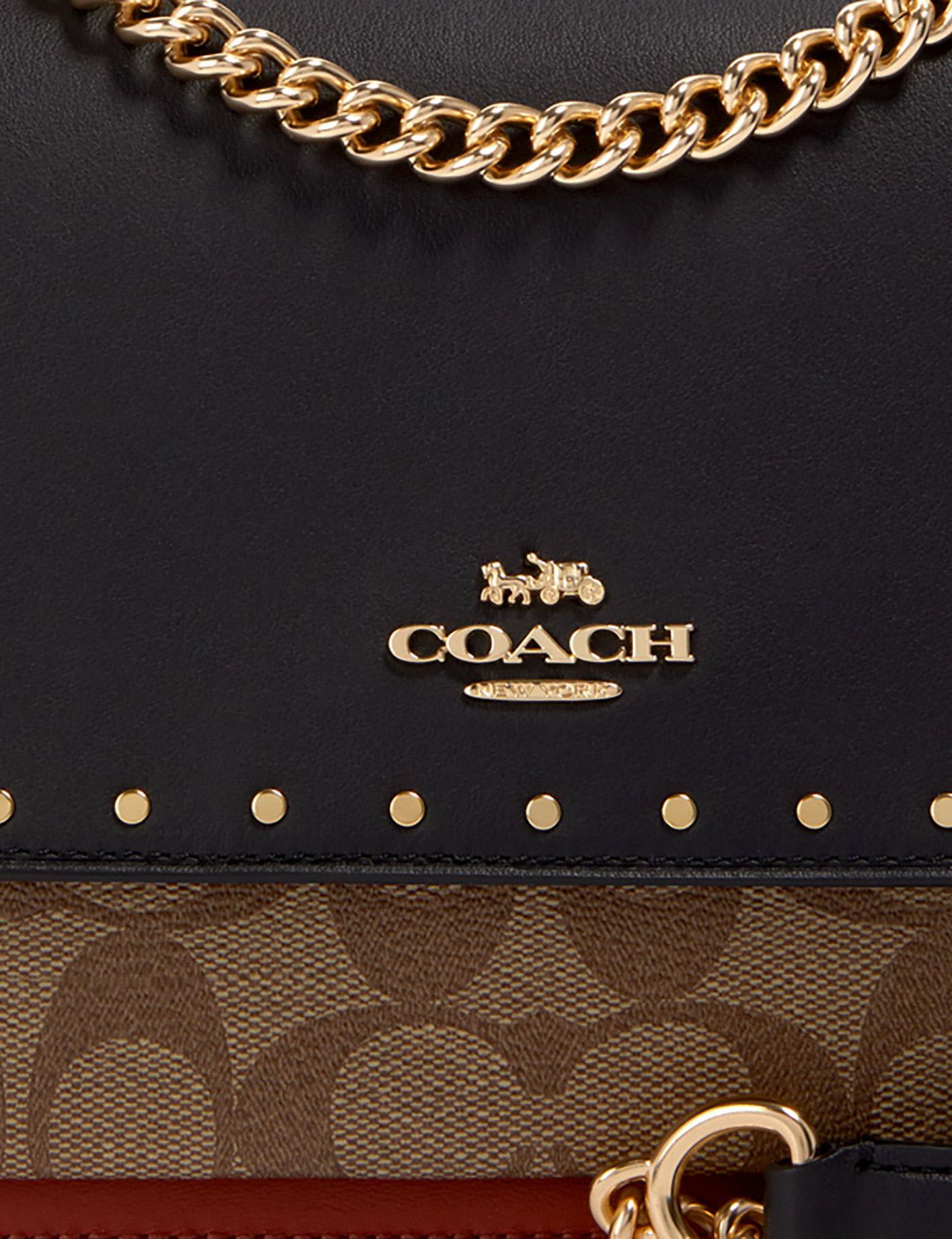 This COACH is made of smooth leather and a signature coated canvas and snake-embossed leather. It has inside zip and multifunction pockets and outside slip pocket along with a snap closure and fabric lining.