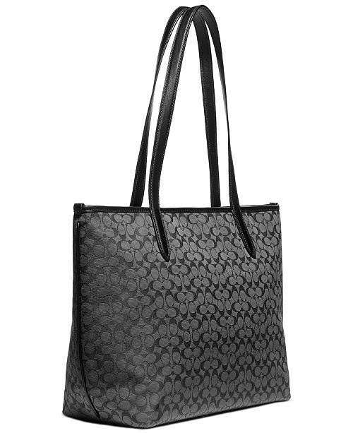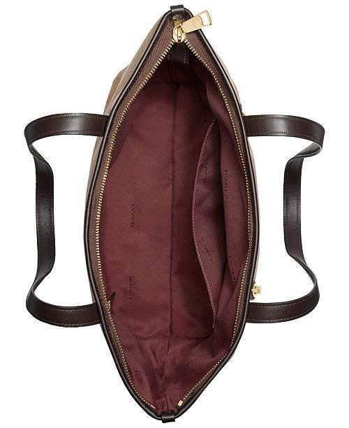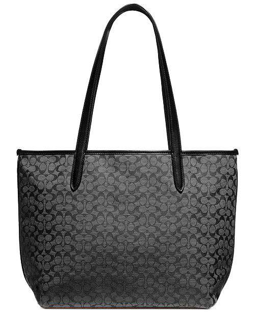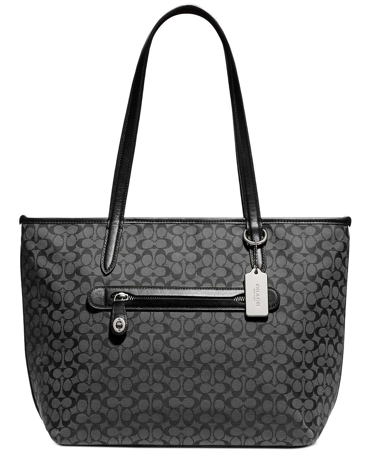 This COACH Taylor Tote bag is Custom-woven in signature jacquard with hand-finished leather trim. It combines subtle texture with a bright flash of hardware.