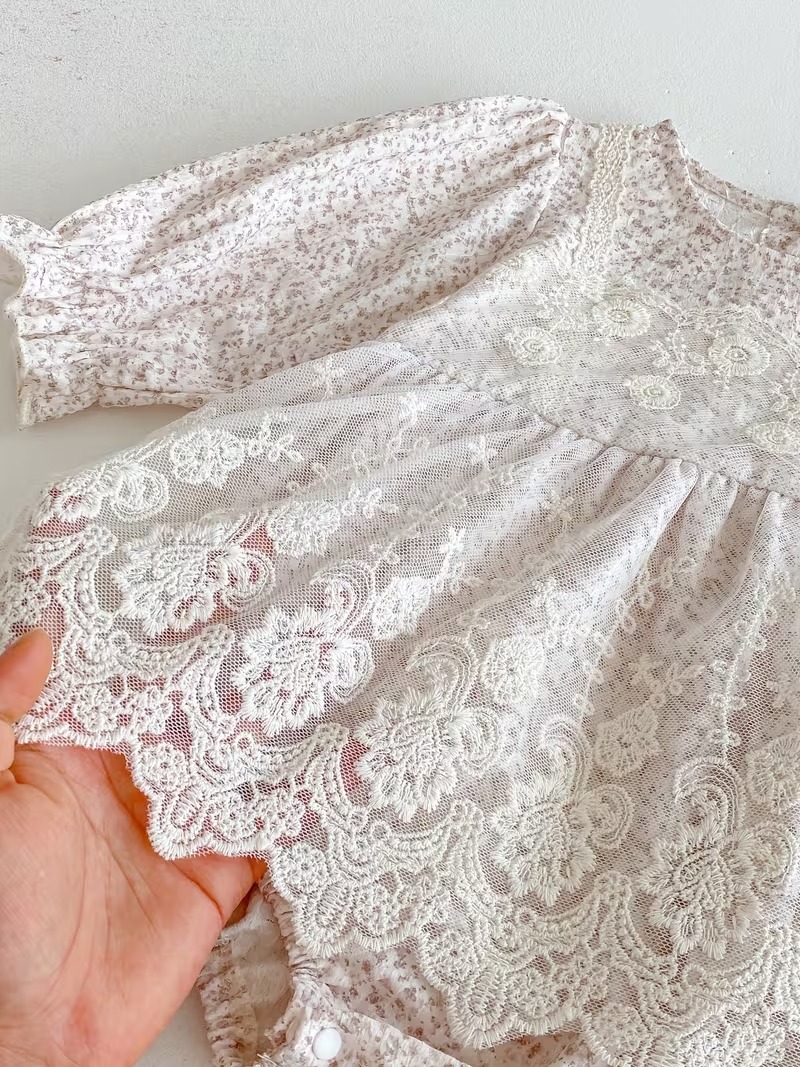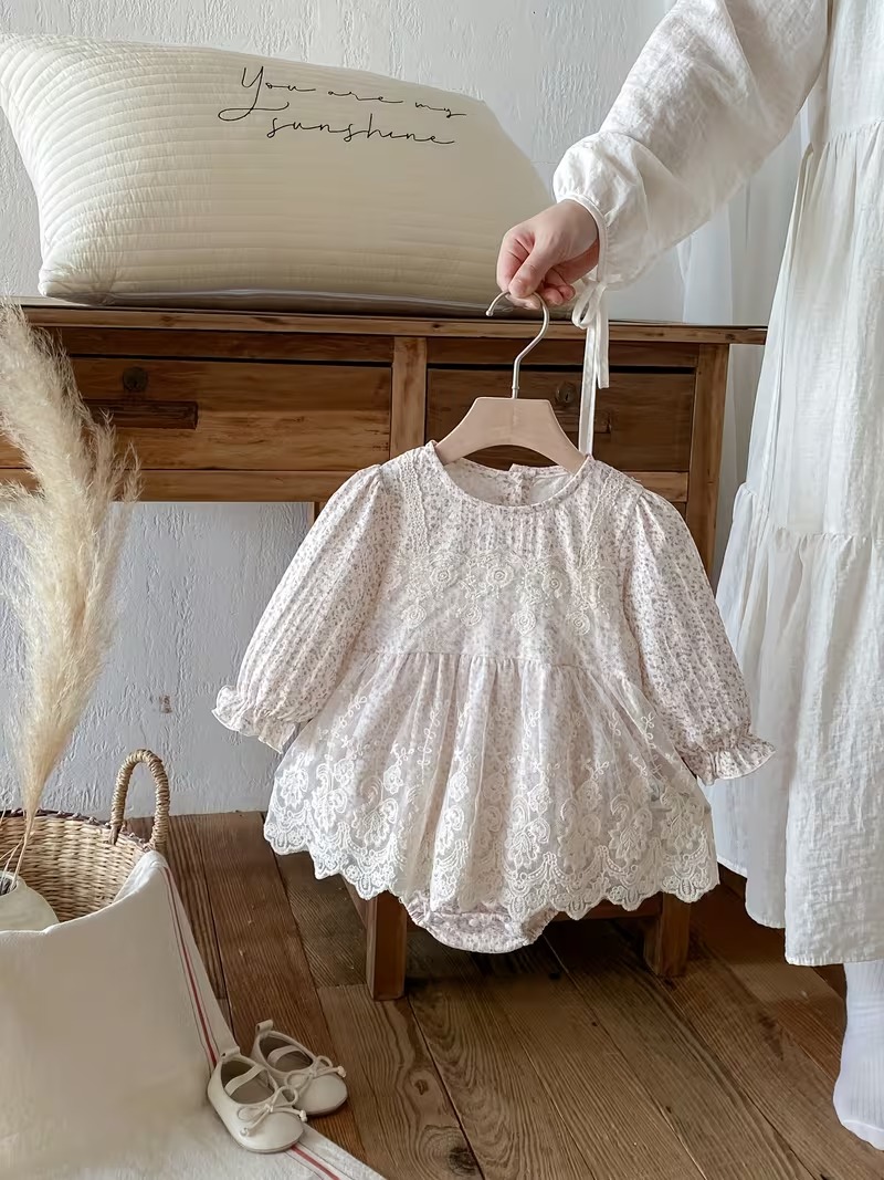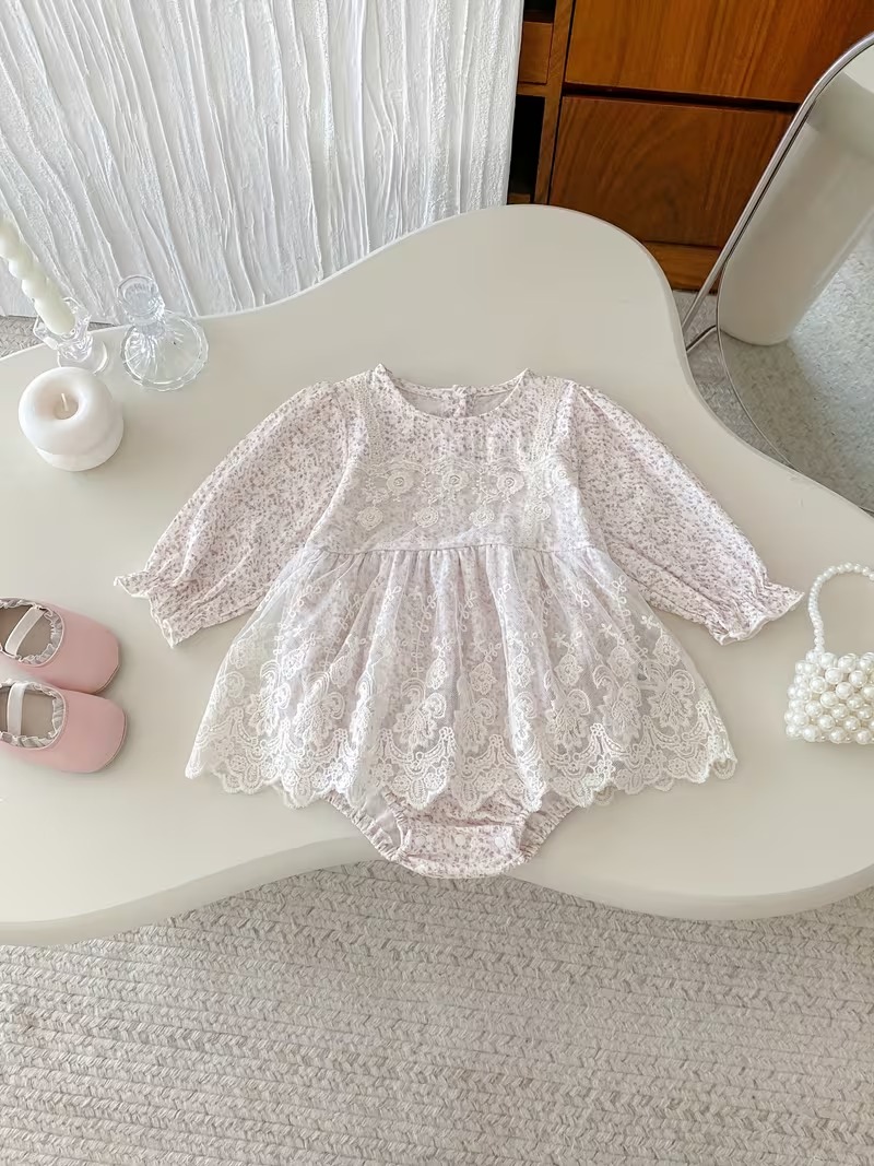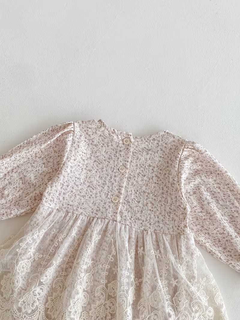 Girls’ Long Sleeve Contrast Lace Princess Triangle Romper Dress