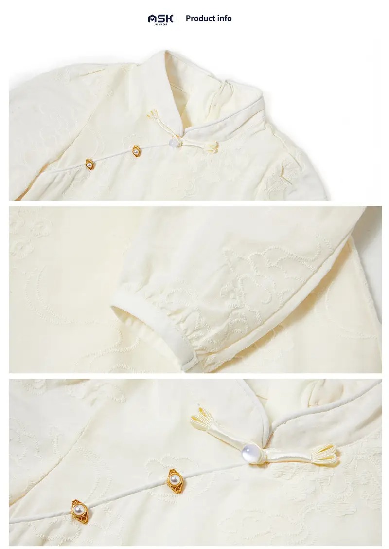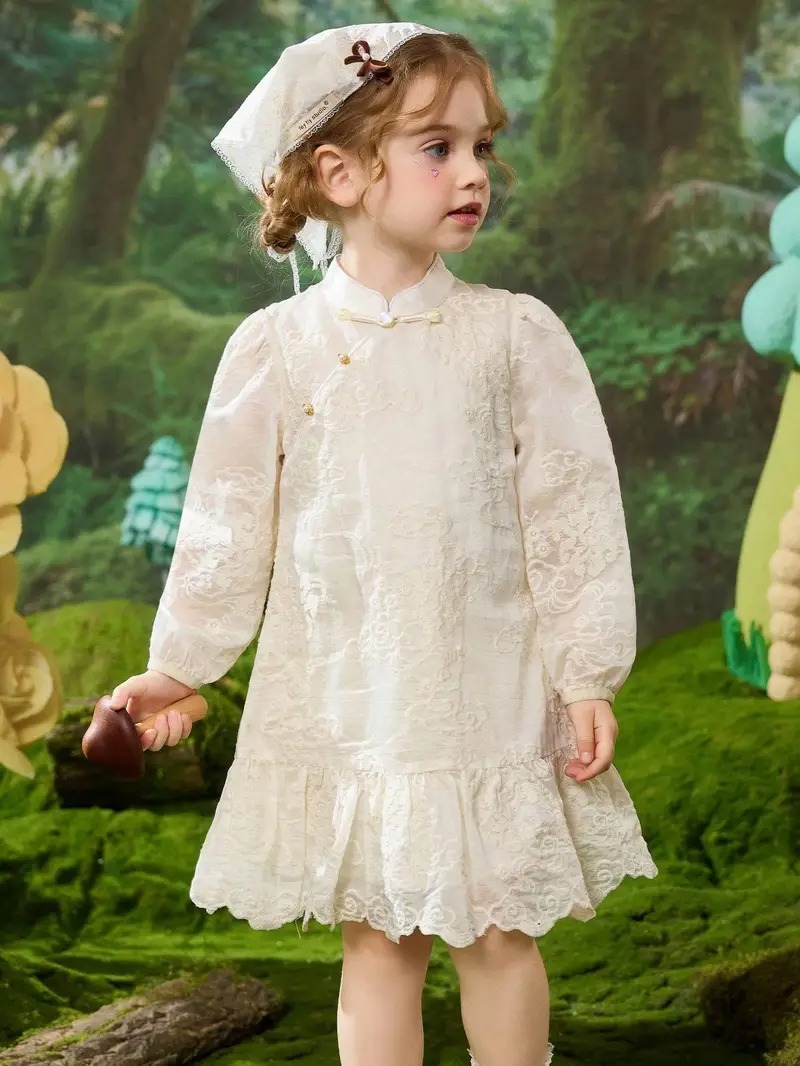 | Girls’ Elegant Floral Print Dress with Stand Collar & Long Sleeves