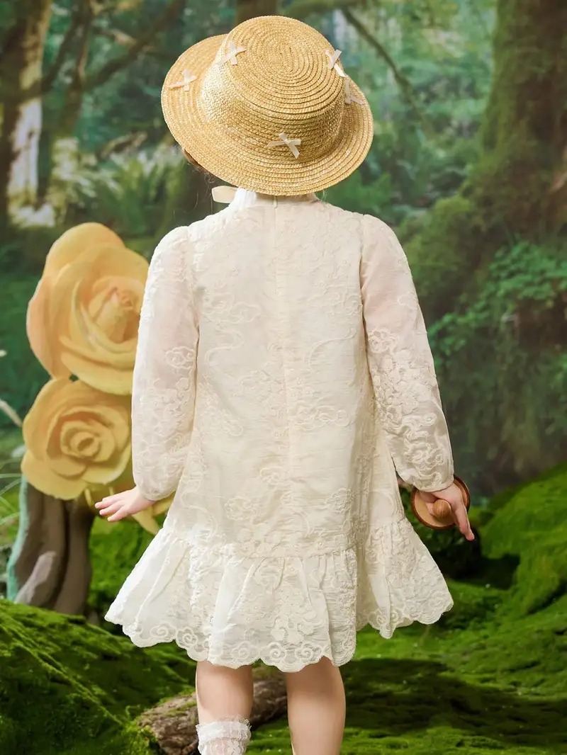 Girls’ Elegant Floral Print Dress with Stand Collar & Long Sleeves