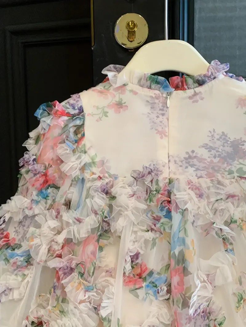 Girls’ Elegant Floral Print Dress with Stand Collar & Long Sleeves