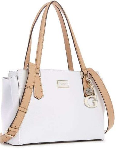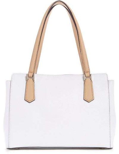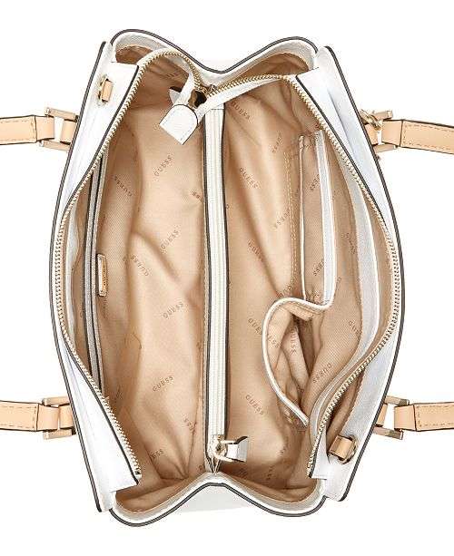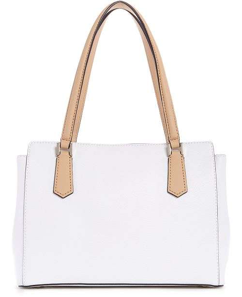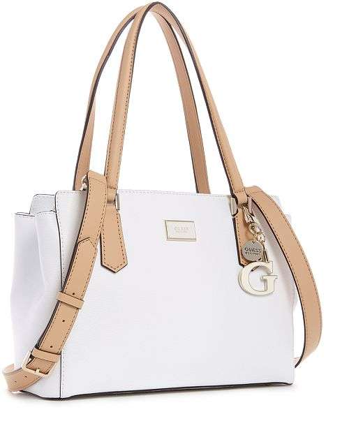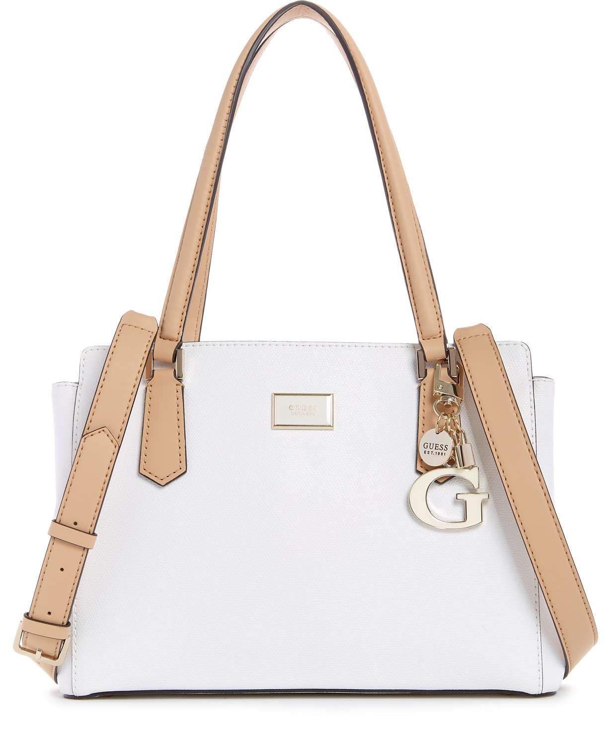 An elegant style that holds all of the necessities. This satchel from GUESS flaunts two-tone styling for a touch of flair.