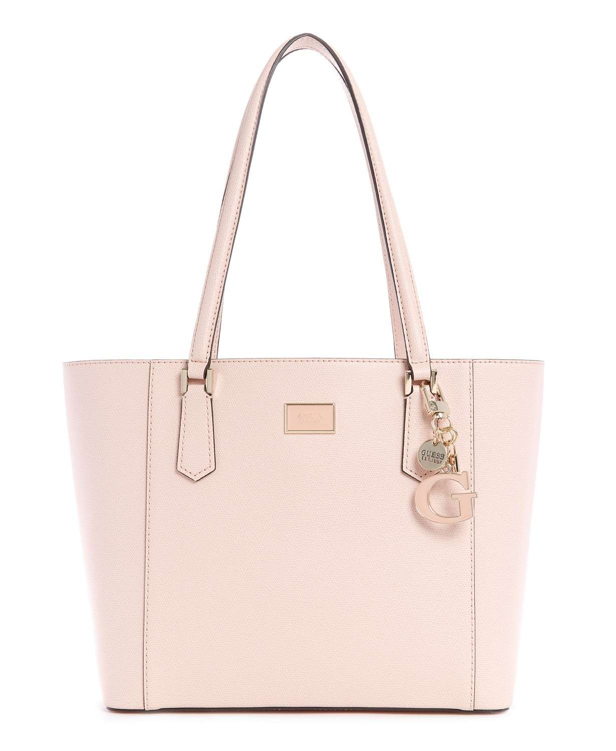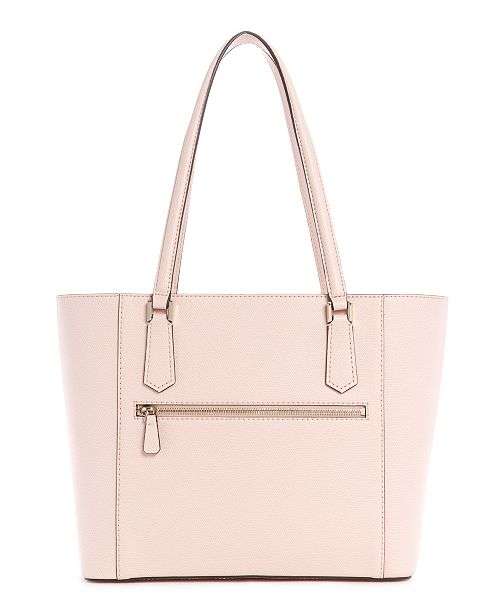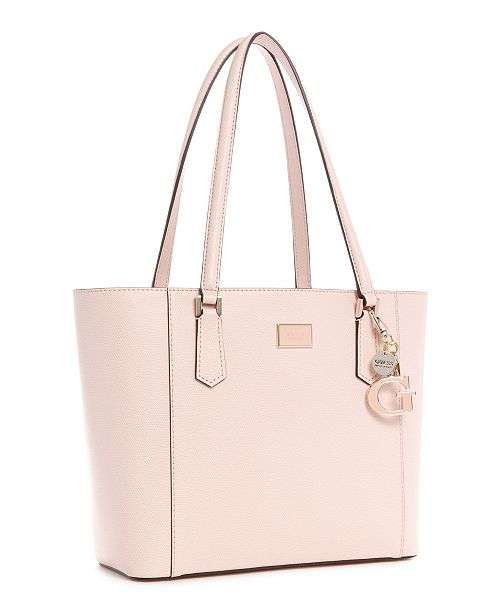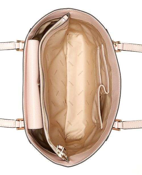 You can carry all your stuff in this stylish large tote from GUESS. It features a Pale shiny gold-tone hardware; 1 back zipper pocket and a magnetic snap closure.