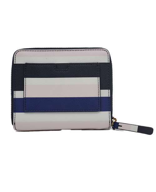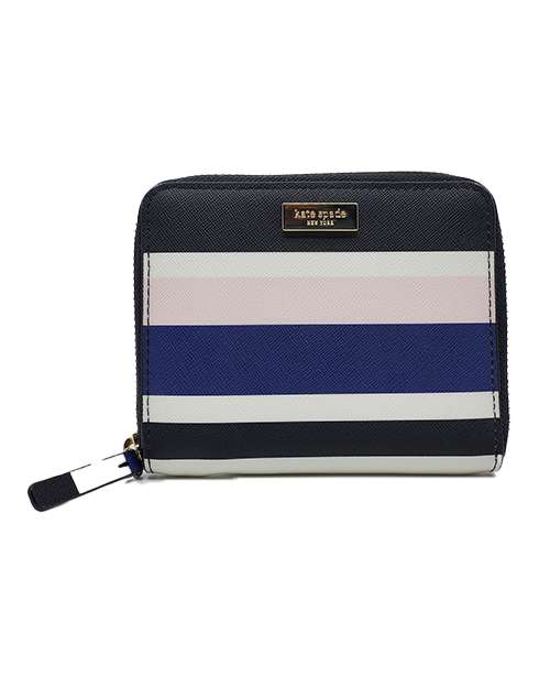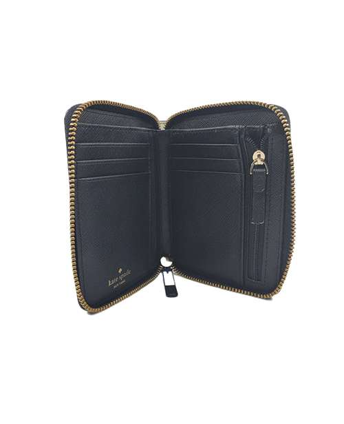 This medium saffiano leather Kate Spade is a bi-fold wallet features 6 card slots, 1 bill compartment, 1 zipped coin compartment inside and 1 open pocket on back.
