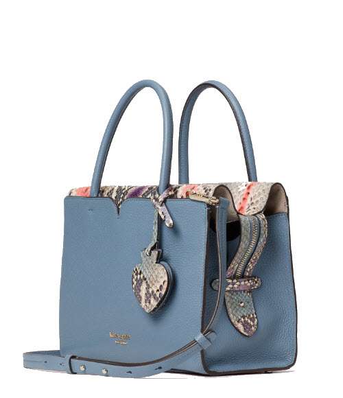 This Kate Spade Spencer Medium Satchel consists of pebbled leather with snake-embossed Italian leather trim and Kate Spade pin-mount logo.