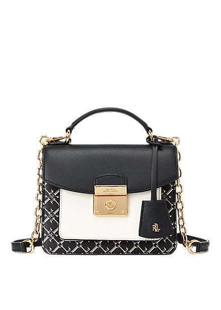 This structured Lauren Ralph Lauren satchel is made from refined leather in bold color-blocking and finished with a signature Lauren print and lock. A removable crossbody strap allows for versatile carrying options.