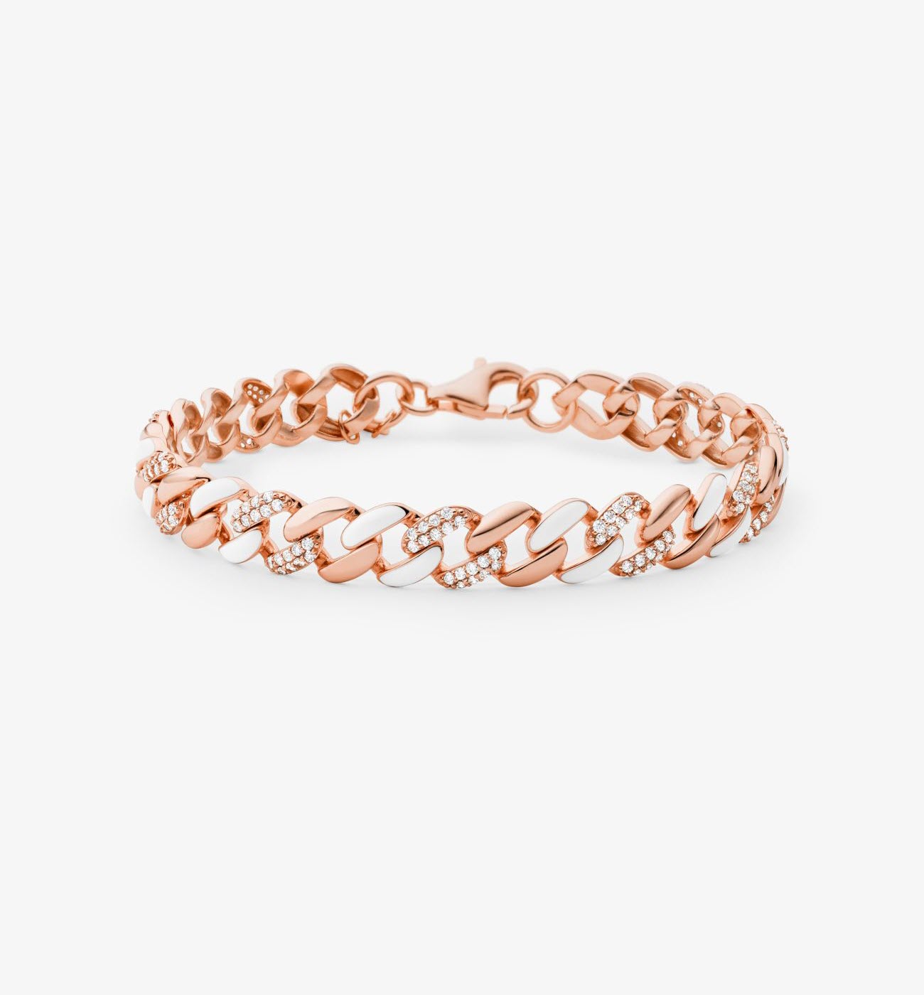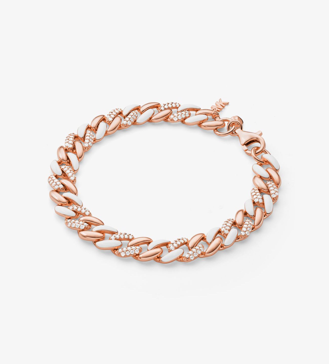 This MK curb-link bracelet combines 14K gold-plated sterling silver with a white finish and pavé links.
