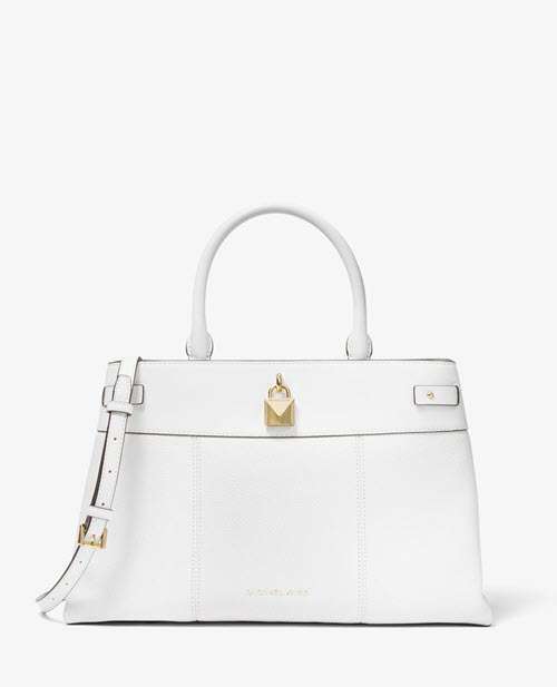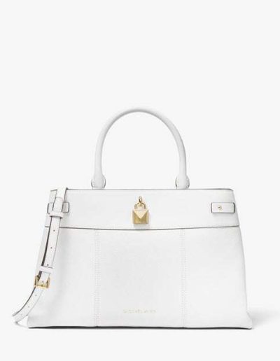 This MK Gramercy satchel has a refined shape made from pebbled and smooth leather. Finished with a lock charm, this sophisticated accessory boasts a structured top handle and adjustable shoulder strap.