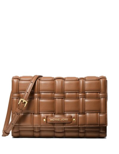This MK Crossbody bag is made of Woven (52% polyurethane and 48% polyester) and Gold-tone hardware. The lining is 100% polyester with snap fastening.