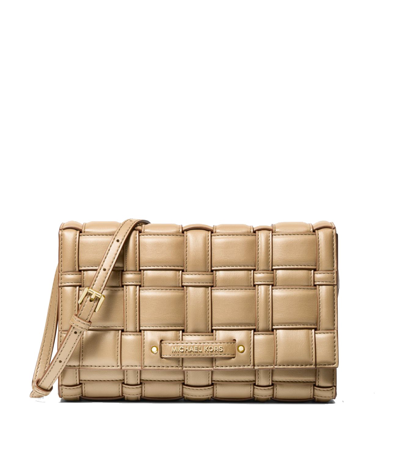 This MK Crossbody bag is made of Woven (52% polyurethane and 48% polyester) and Gold-tone hardware. The lining is 100% polyester with snap fastening.