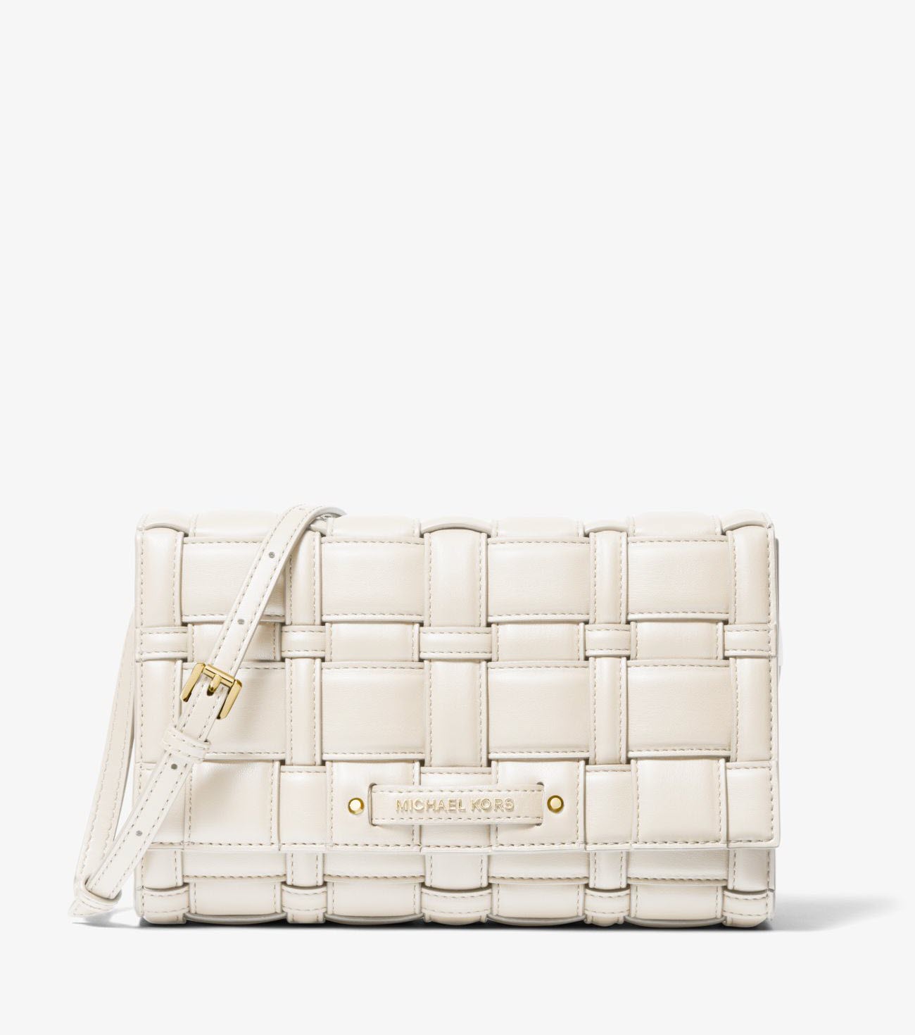 This MK Crossbody bag is made of Woven (52% polyurethane and 48% polyester) and Gold-tone hardware. The lining is 100% polyester with snap fastening.