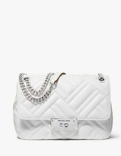 The MK Peyton Medium Patent Shoulder Bag is made of Patent Polyurethane blend. It has a silver-tone hardware. It has a back zip pocket with a center zip.