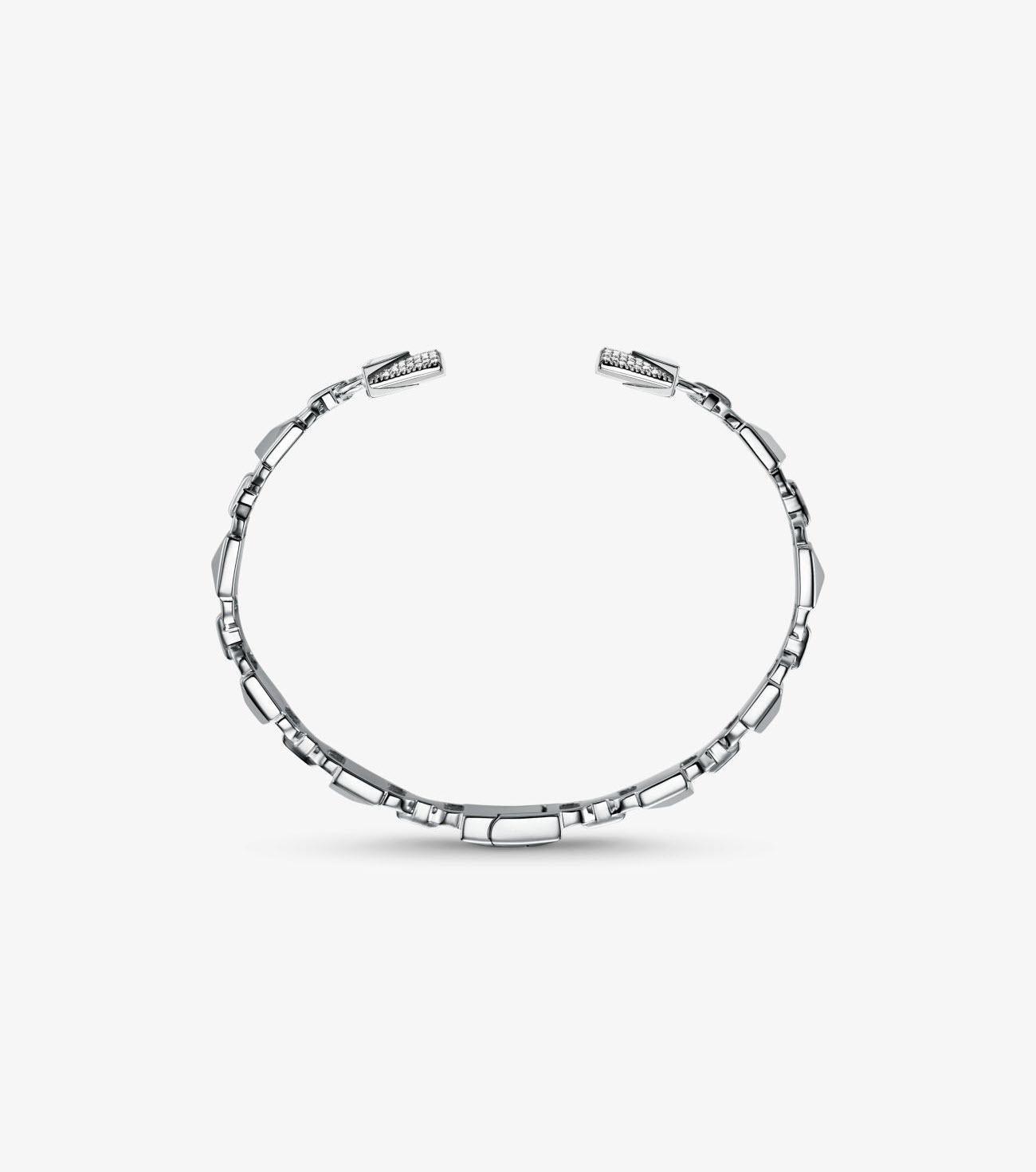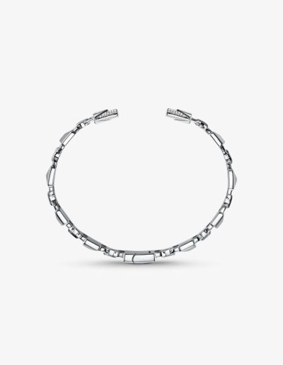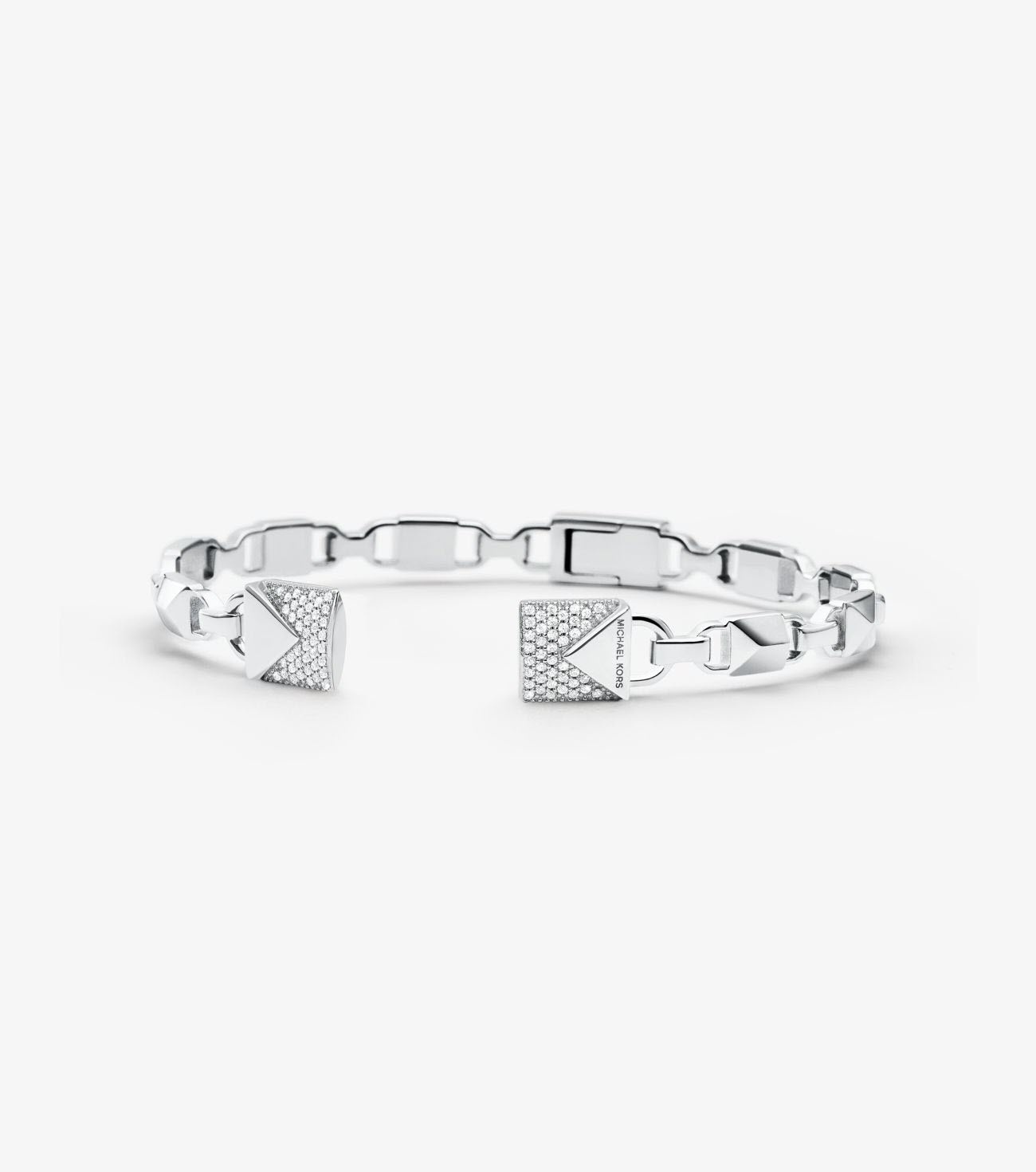This open hinge bangle showcases a linked design inspired by MK iconic Mercer lock. It’s crafted from sterling silver. Sparkling pavé accents finish this piece with a touch of glamour.