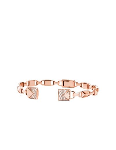 This open hinge bangle showcases a linked design inspired by MK iconic Mercer lock. It’s crafted from sterling silver. Sparkling pavé accents finish this piece with a touch of glamour.
