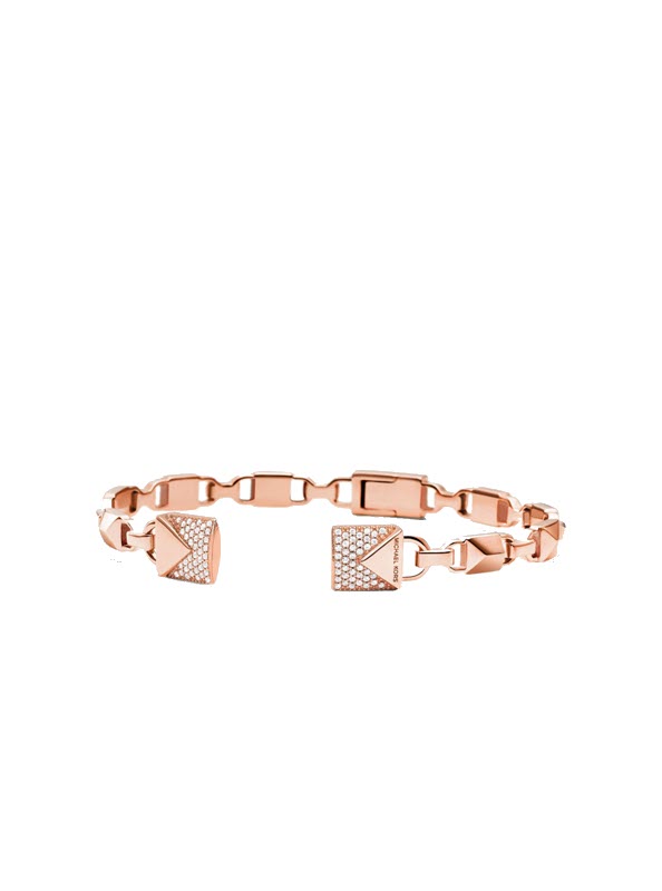 This open hinge bangle showcases a linked design inspired by MK iconic Mercer lock. It’s crafted from sterling silver and is available in rhodium, 14K gold and 14K rose gold platings. Sparkling pavé accents finish this piece with a touch of glamour.