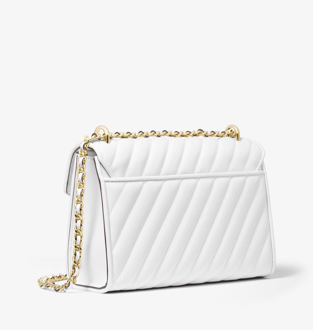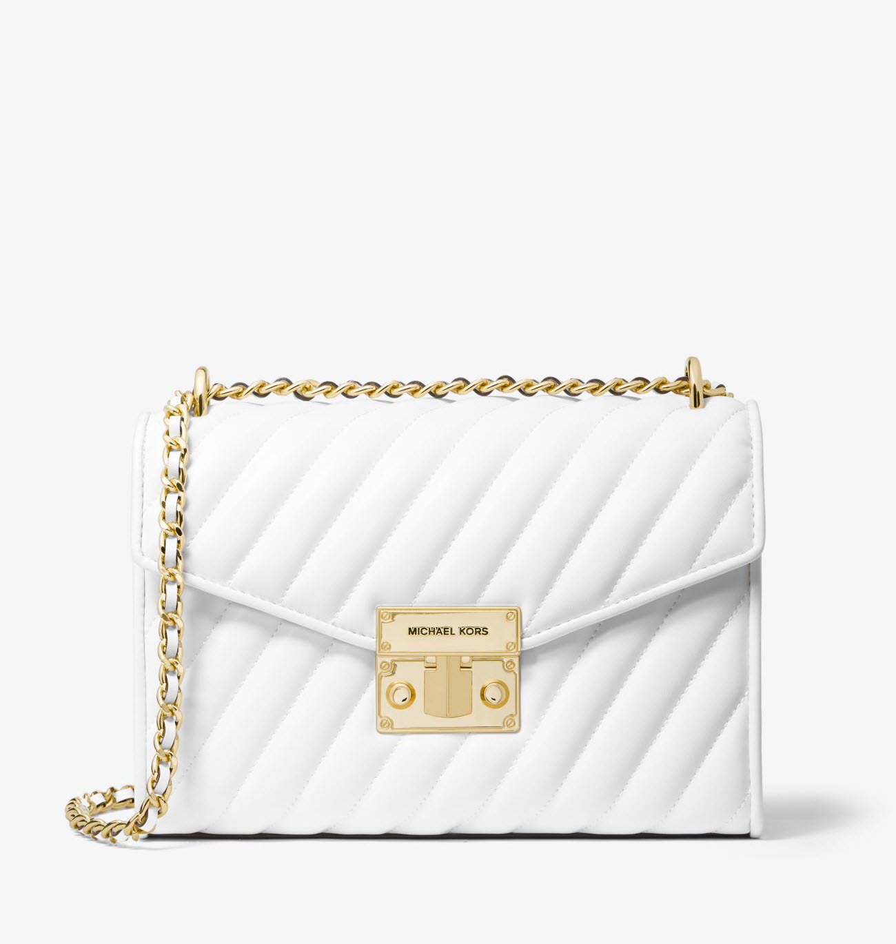 This MK shoulder bag is made of polyurethane blend (52% polyurethane and 48% polyester) and Gold-tone hardware. The lining is 100% polyester. It features a polished push-lock fastening and elegant chain strap for luxe effect.