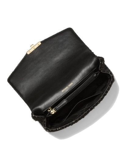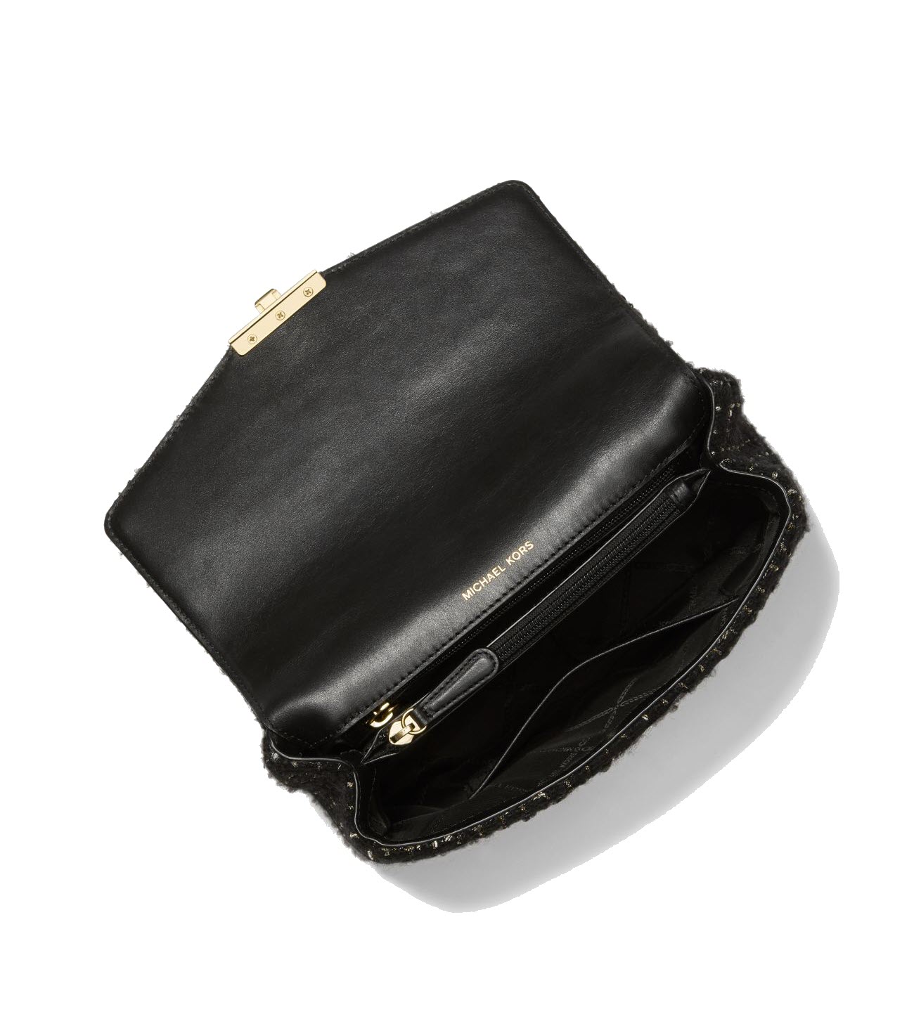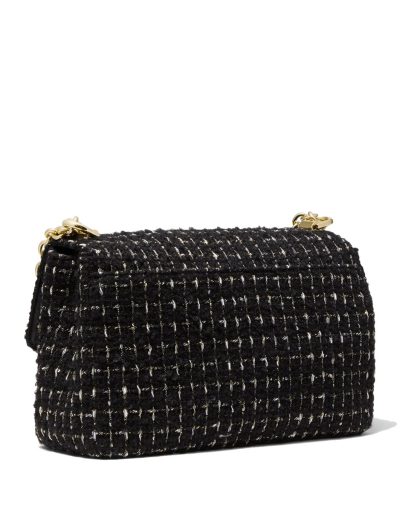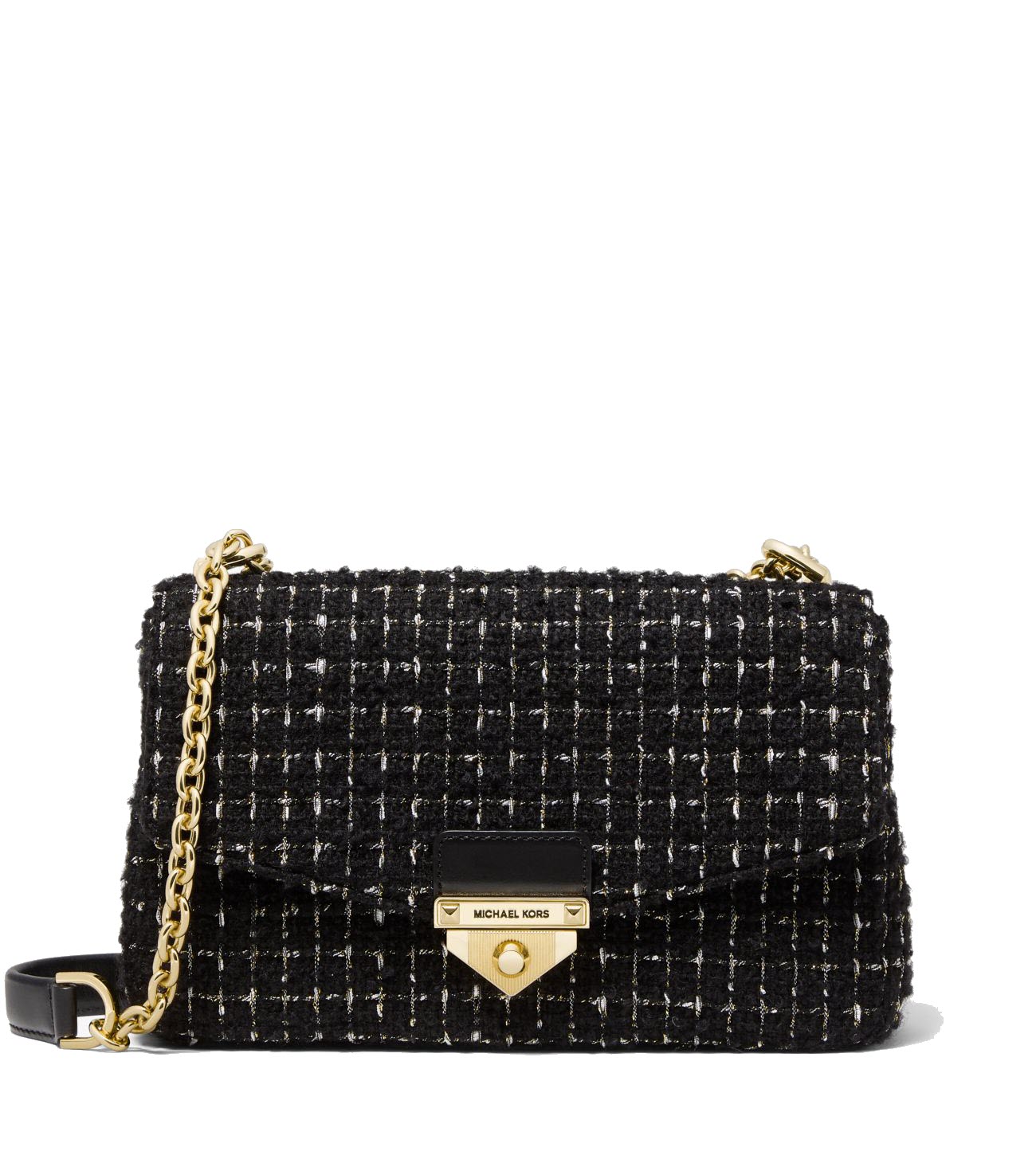 This MK SoHo shoulder bag is made from 50% wool, 50% polyester. Its trim is 100% leather and the lining is 100% polyester with a Gold-tone hardware.