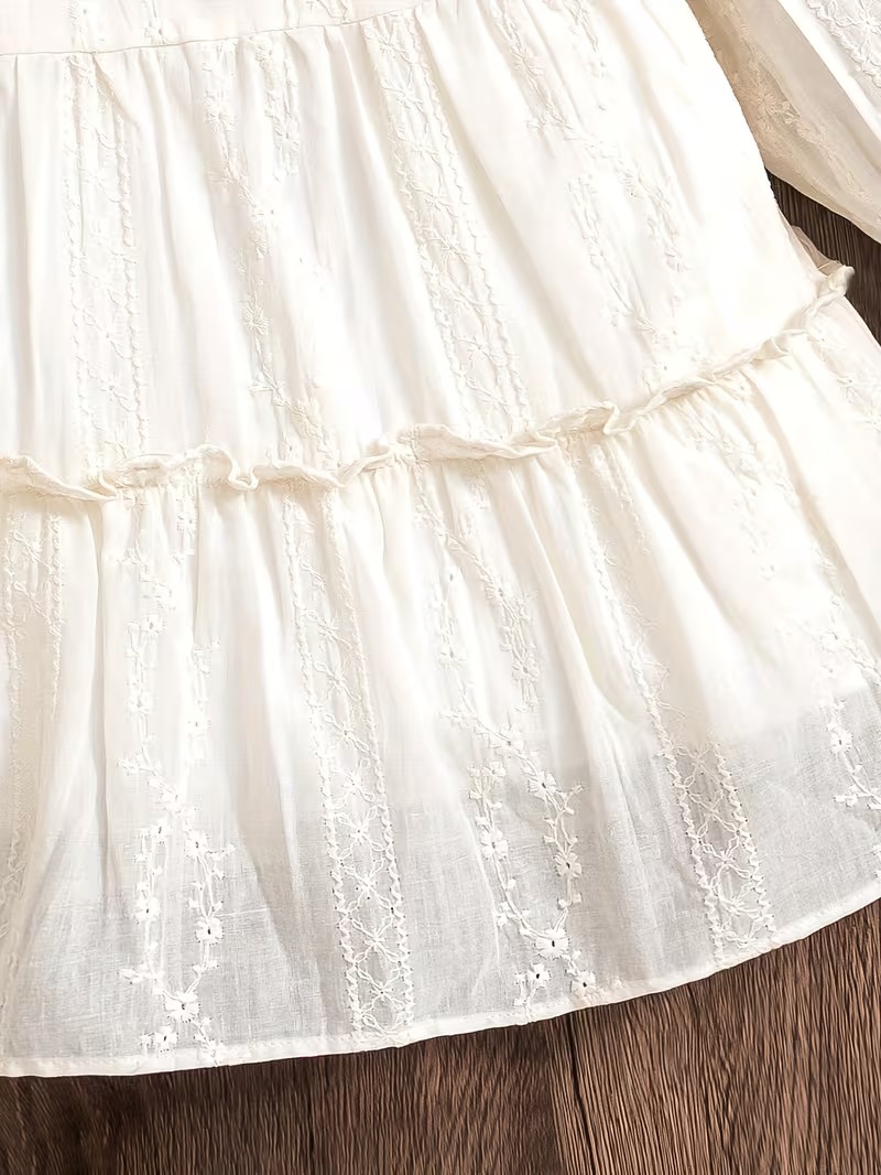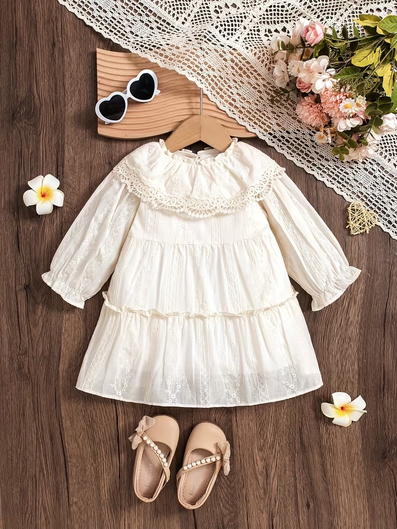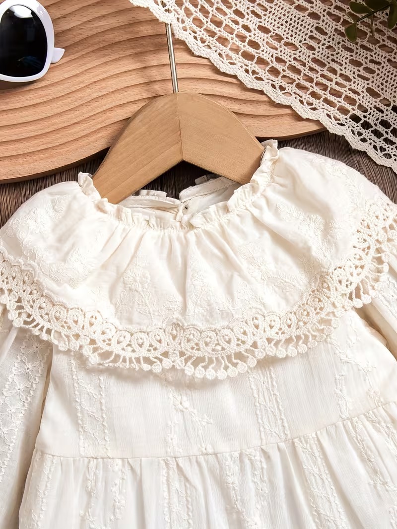 Girls’ Elegant Long Sleeve Princess Dress with Floral Embroidery & Lace Trim